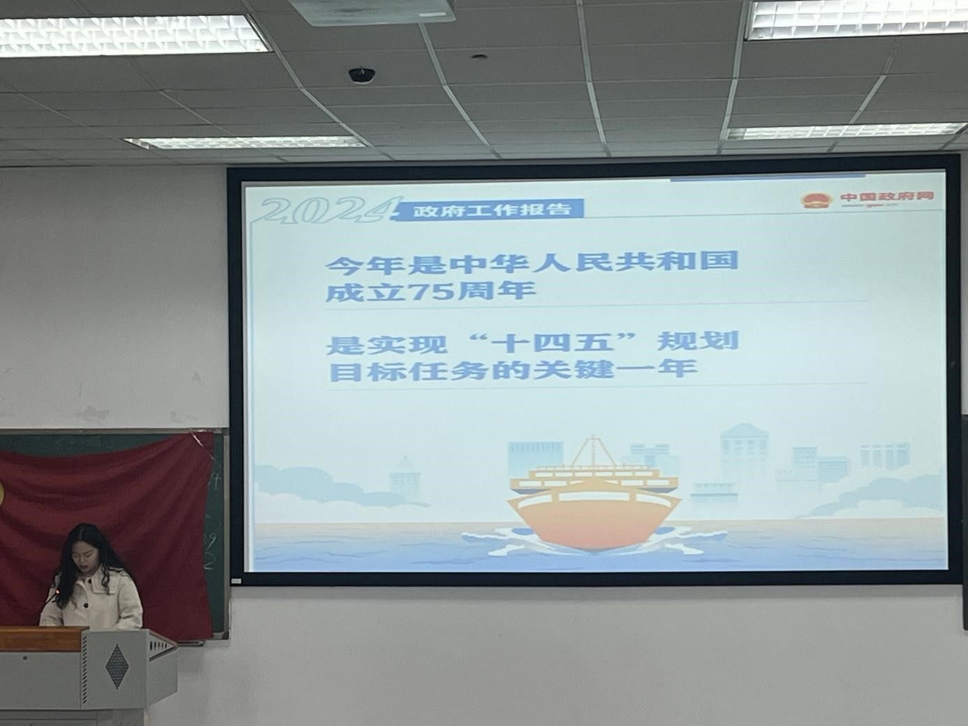 会议伊始,主持人倪世壮和何宛臻介绍了两会基本概念、召开时间以及召开意义,并从推动绿色发展理念、党心民心的同频共振、人民民主的生动实践三个方面解读政府工作报告,使参与者对两会有了更加全面深刻的认识。随后,支部成员进行两会学习心得交流,在学习中深刻认识到中国共产党确立习近平新时代中国特色社会主义思想的指导地位是时代呼唤、历史选择、民心所向,是新时代中国战胜风险挑战、取得辉煌成就的根本所在。最后,石宇星号召道:“我们作为新时代的新青年,要踏着新时代的旋律,走在继往开来的大路上,合着伟大复兴中国梦的节拍,要把责任举过头顶、用忠诚彰显担当,不忘初心,牢记使命,在为人民服务的路上书写自己的青春华章。”