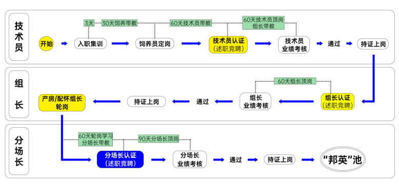 ★ 老员工6-12个月轮岗培训(以生产技术岗为例):第1个月饲养员岗位实训——第2至第3个月技术员岗位带教——第4至第6个月生产组长岗位带教——第9至12个月实习分场长岗位带教