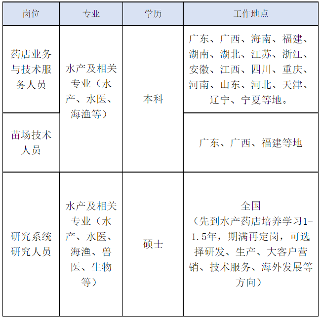 岗位要求:热爱水产事业,吃苦耐劳,愿意在基层工作;学习成绩优秀,具有良好的沟通能力和协作精神;身体健康,无传染性疾病;三好员工、党员或员工干部优先