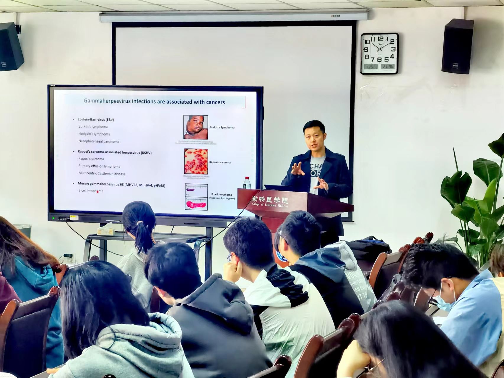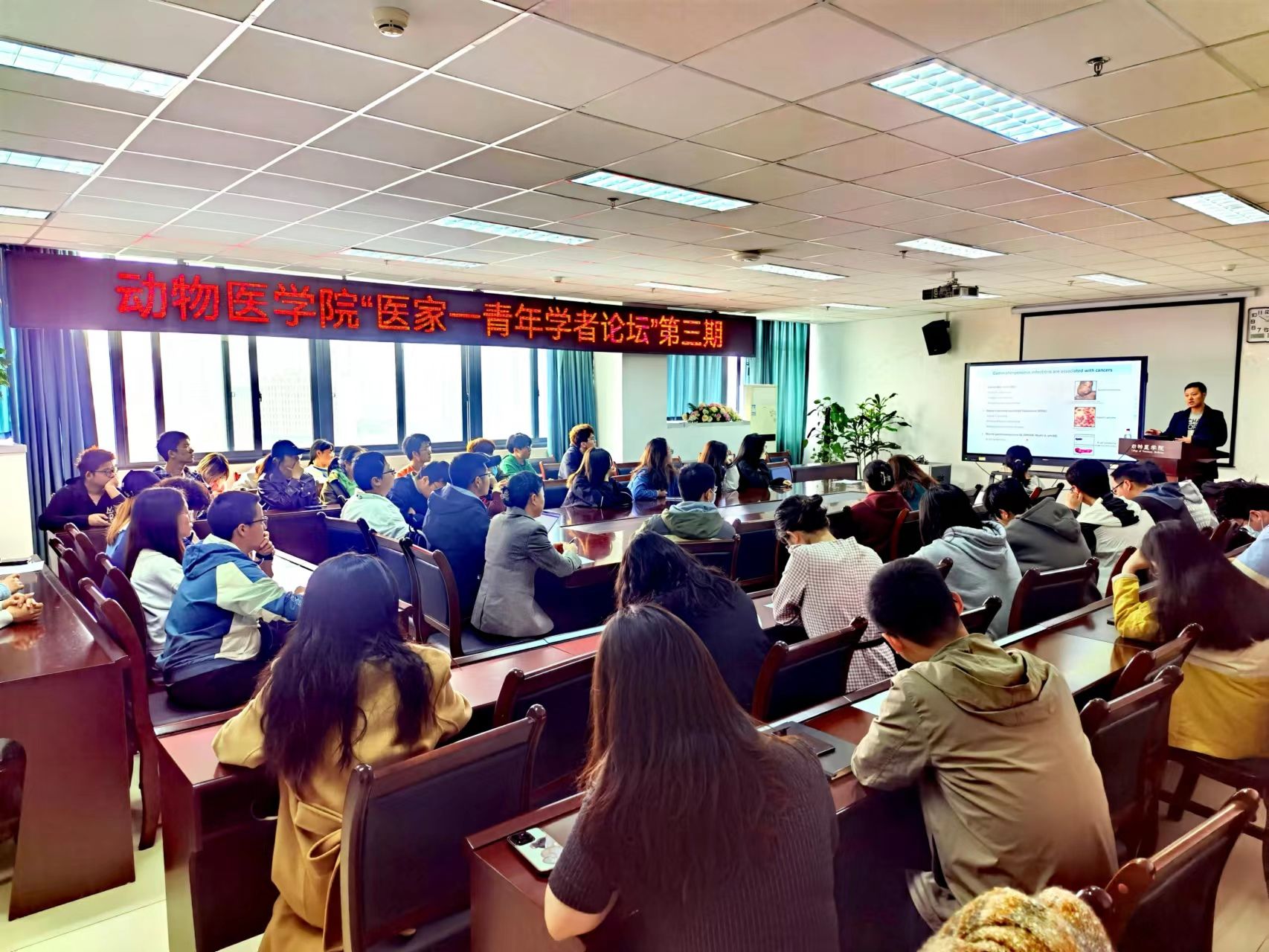 4月25日 上午10:00,公司新引进人才王一平博士在7-1109为全院师生做了题为《EWSR1在病毒感染与生发中心B细胞反应中的作用》的学术报告,会议由预防兽医系主任黄小波教授主持。
