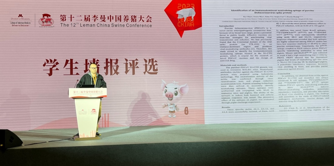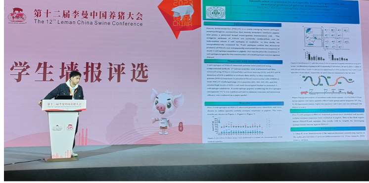猪δ冠状病毒(PDCoV)结构蛋白SLA-I限制性T细胞抗原表位的鉴定)”。他们的汇报主要介绍了公司猪病研究中心在猪δ冠状病毒(PDCoV)的B细胞中和抗原表位与T细胞抗原表位的最新研究进展。该研究为PDCoV免疫机制及新型疫苗研发奠定了基础。